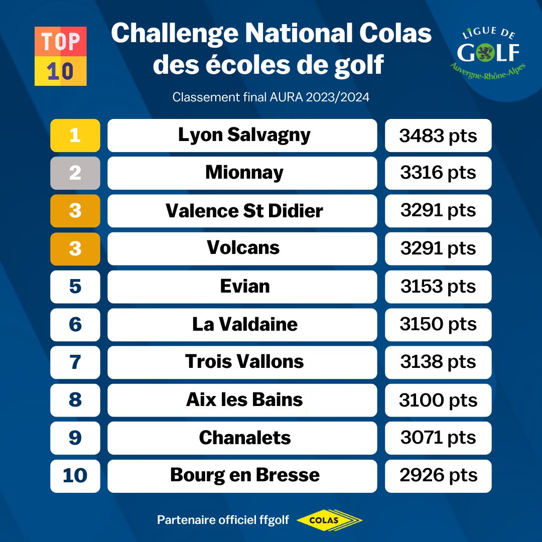 Félicitations à Lyon Salvagny qui termine en tête du classement, ainsi qu’à Mionnay pour sa 2nd place et à Valence Saint-Didier et aux Volcans ex-aequo à la 3eme place.